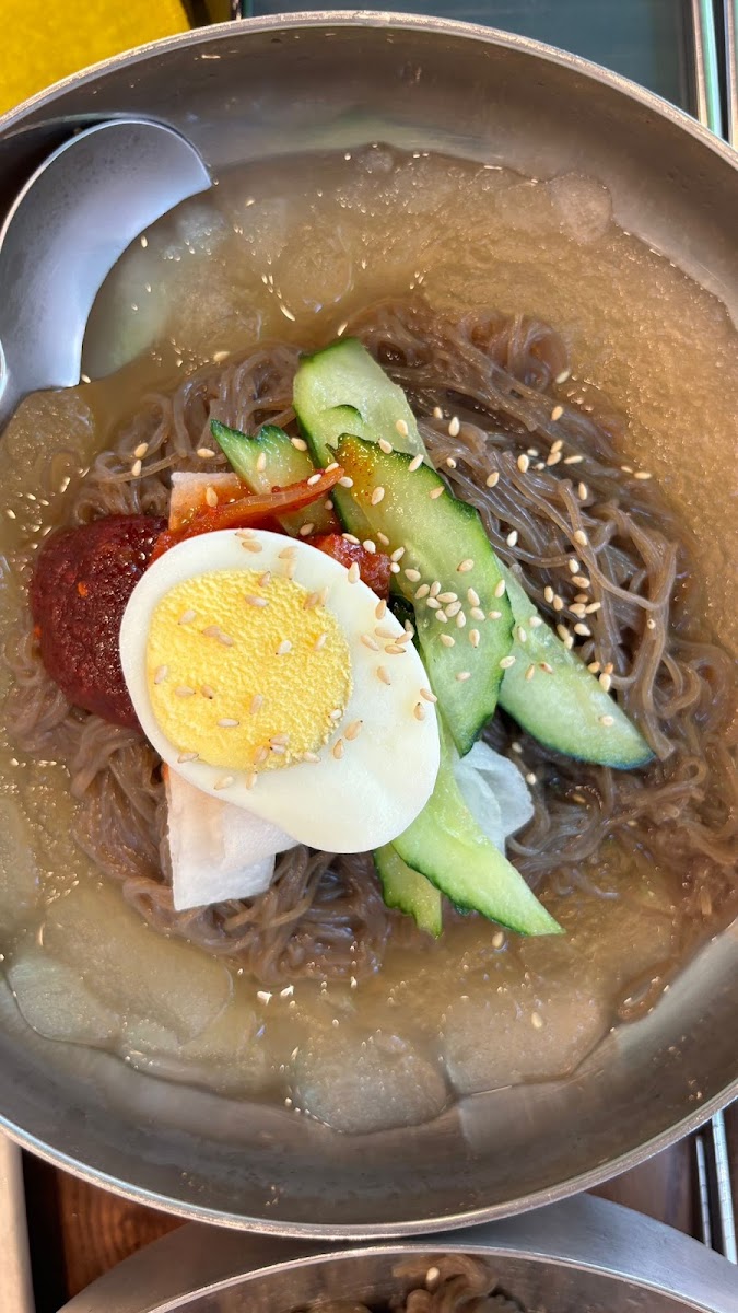 If you're in the mood for something refreshing, the 冷麺 (naengmyeon) is a must-try. This chilled noodle dish is a hit during Busan's hot summer months, offering a satisfying contrast with its tangy broth, chewy noodles, and garnished with fresh vegetables and slices of beef. Another exceptional dish on the menu is プルコギのキンパ (Pulgogi Kimbap), which features a savory beef-filled kimbap, offering a unique twist on the traditional rolled rice snack.